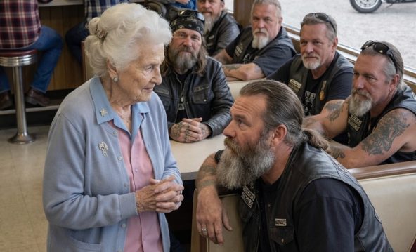 Une vieille femme s’assit parmi six motards marqués par la route, faisant semblant qu’ils étaient ses fils le temps d’un après-midi — sans se douter que lorsque l’homme venu réclamer sa maison arriverait, le plan qu’il avait minutieusement préparé s’effondrerait soudainement.